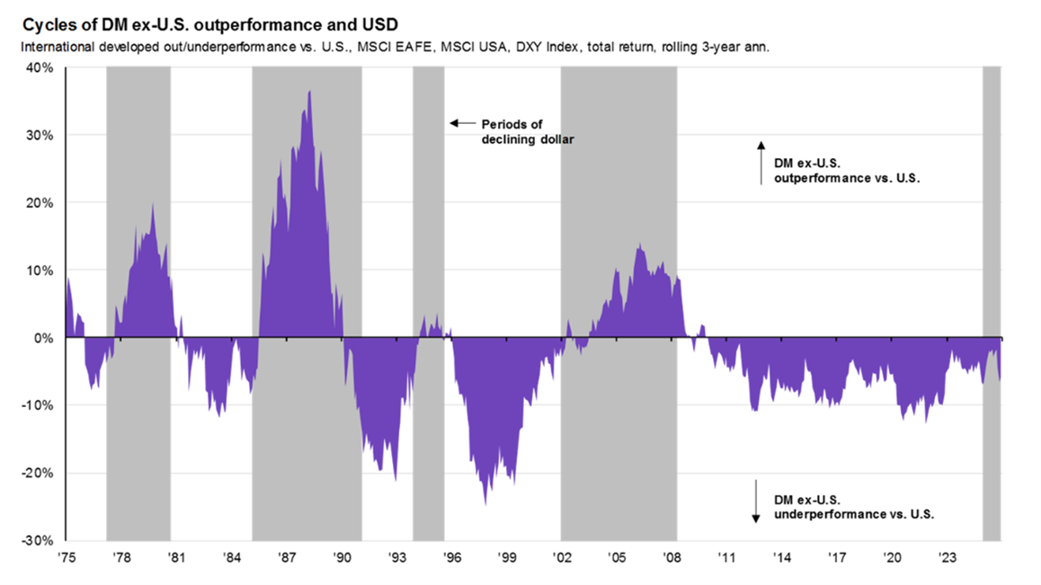 International markets outperformance: After a prolonged period of underperformance versus U.S. markets, international stocks nearly doubled the return of U.S. stocks as evidenced by the 32.6% return of foreign markets (MSCI All Country World Index ex US). This can be attributed to several factors; a weakening U.S. dollar, much lower valuation metrics of foreign stocks, increased spending by foreign governments to spur their economies and a softening of regulations among other country-specific factors. The graph below shows the underperformance of international stocks since 2008 as well as past cycles of over and under-performance (based on three-year rolling returns).
